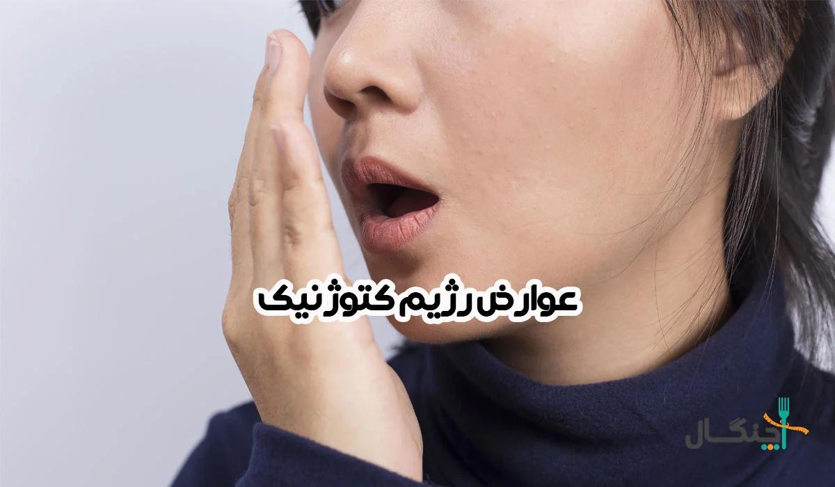 بوی بد دهان هم یکی از شایعترین و آزاردهندهترین عوارض است. این بو به مادهای به نام استون (Acetone) مربوط است که یک نوع کتون به شمار میرود و در اثر متابولیسم چربی تولید میشود.