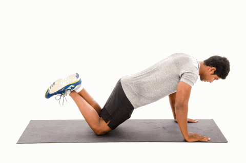 - به سرعت زانوی چپ و دست راست را پایین بیاورید و همین حرکت را با زانوی راست و دست چپ انجام دهید.
